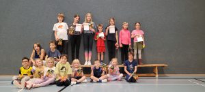Auch im Sportjahr 2020/21 haben die Jüngsten unseres Clubs hart und erfolgreich für ihr Sportabzeichen trainiert. Hier stellen sie sich stolz mit ihrer Trainerin Kirsten Winker dem Fotografen.